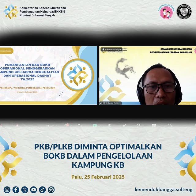 "Kampung KB (Keluarga Berkualitas) yang menjadi program unggulan kita agar betul-betul dipantau perkembangannya, karna tentunya di tahun ini akan tetap kita lombakan, kita nilai kira-kira Kampung KB mana yang akan diunggulkan, dibina, dinilai, dan dilombakan hingga tingkat pusat. Sehingga saya berharap Kampung KB betul-betul diberdayakan agar terjadi kerjasama lintas sektor di lingkungan tersebut", ujar Kepala Kementerian Kependudukan dan Pembangunan Keluarga (Kemendukbangga/BKKBN) Perwakilan BKKBN Provinsi Sulawesi Tengah, Tenny Calvenny Soriton, S.Sos., MM dalam kegiatan Selasa Menyapa bertema Sosialisasi Dana Alokasi Khusus (DAK) Biaya Operasional Keluarga Berencana (BOKB) Menu Penggerakan Kampung KB dan Dapur Sehat Atasi Stunting (Dashat) yang dilaksanakan secara daring pada Selasa (25/02/2025).